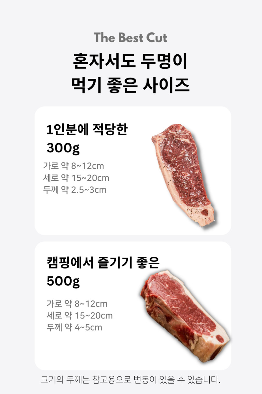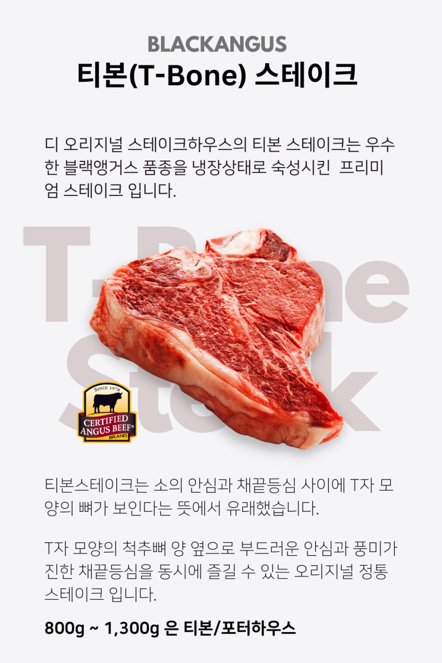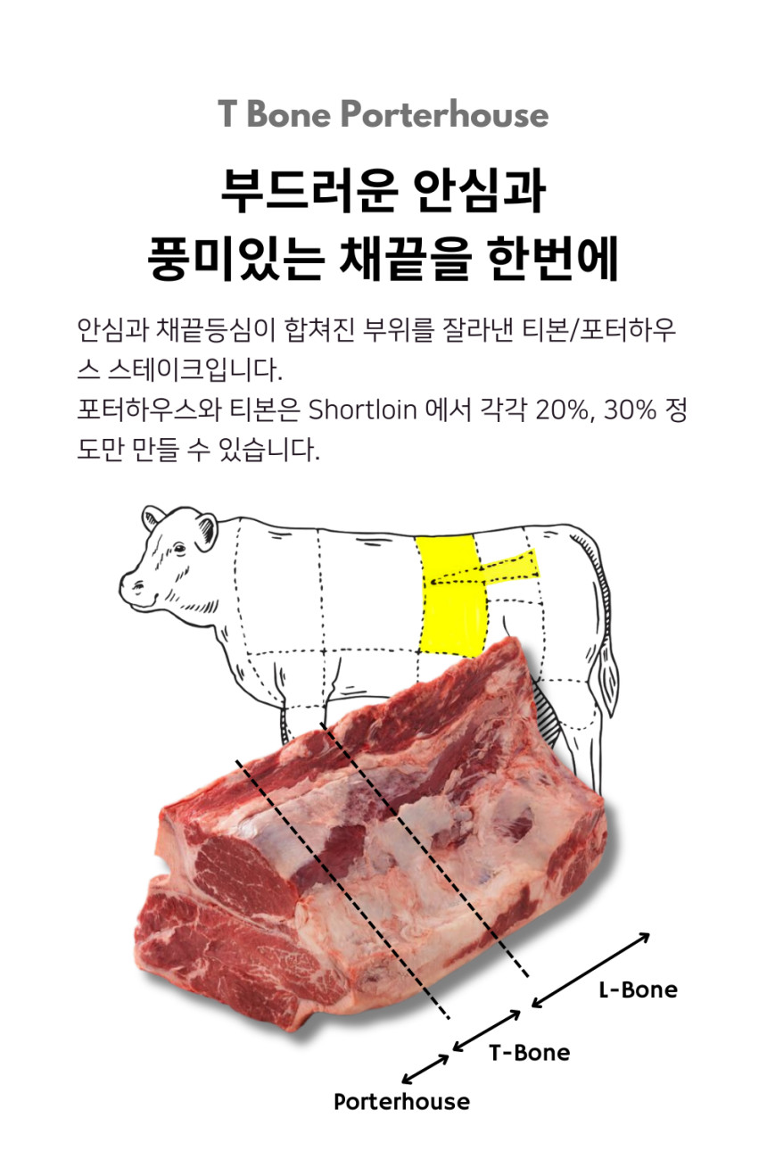 - 안심 크기에 따라 티본과 포터하우스로 구분됩니다 (포터하우스의 안심이 더 큼).