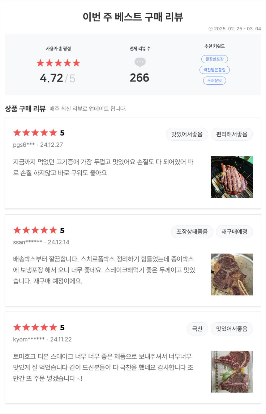 - 가장 부드럽고 기름진 맛: 립아이, 토마호크