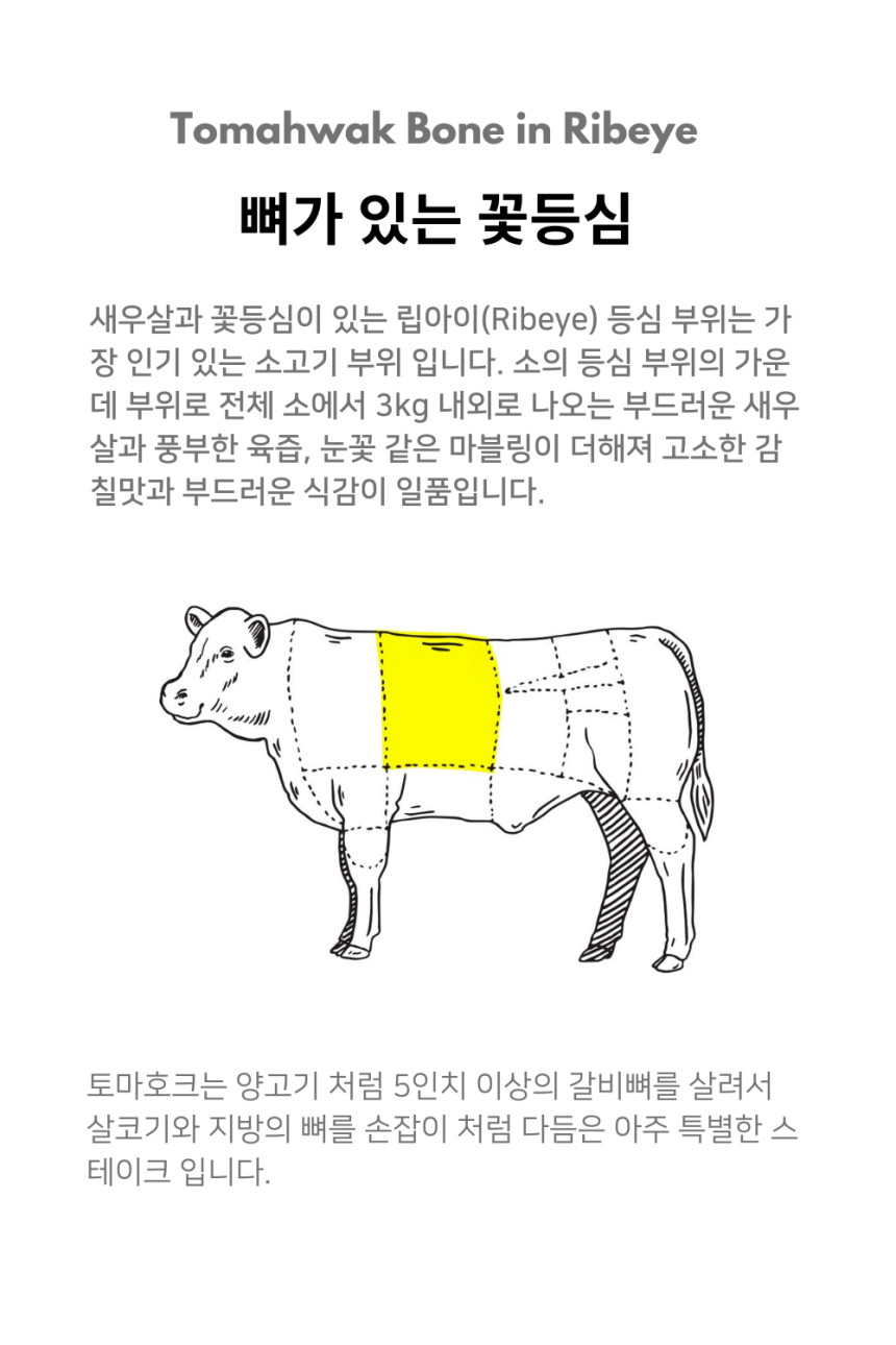 - 특징: 립아이 부위와 동일하나, 뼈가 붙어 있어 비주얼이 압도적이며, 새우살, 알등심살, 늑간살 등 다양한 부위를 한 번에 즐길 수 있습니다.