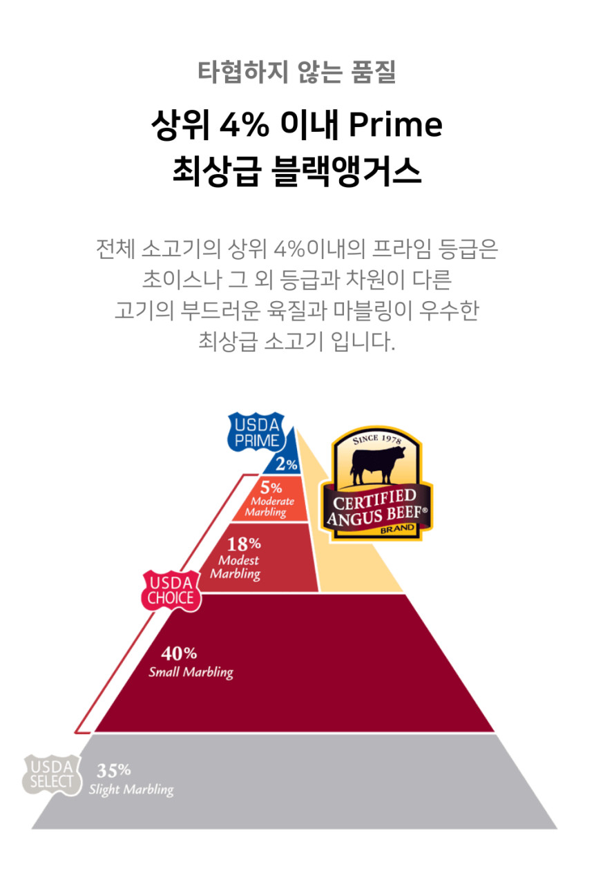 미국산 블랙앵거스 프라임 채끝스테이크는 풍부한 육즙과 부드러운 식감, 깊은 감칠맛을 자랑하는 최고급 소고기입니다. 이는 블랙앵거스 품종의 우수한 육질과 미국 농무부(USDA)의 최상위 등급인 프라임(Prime) 등급이 만난 결과입니다.