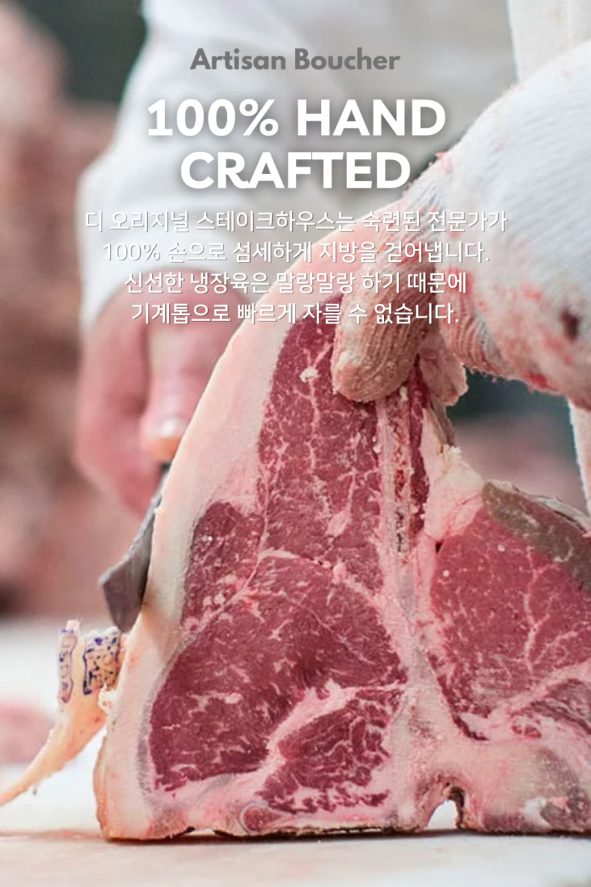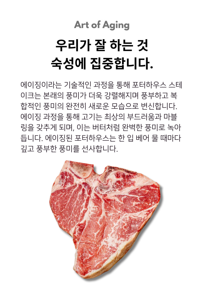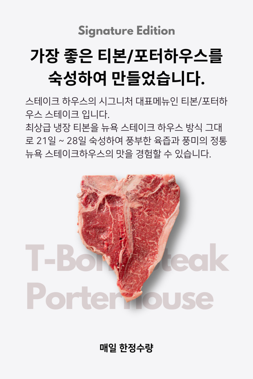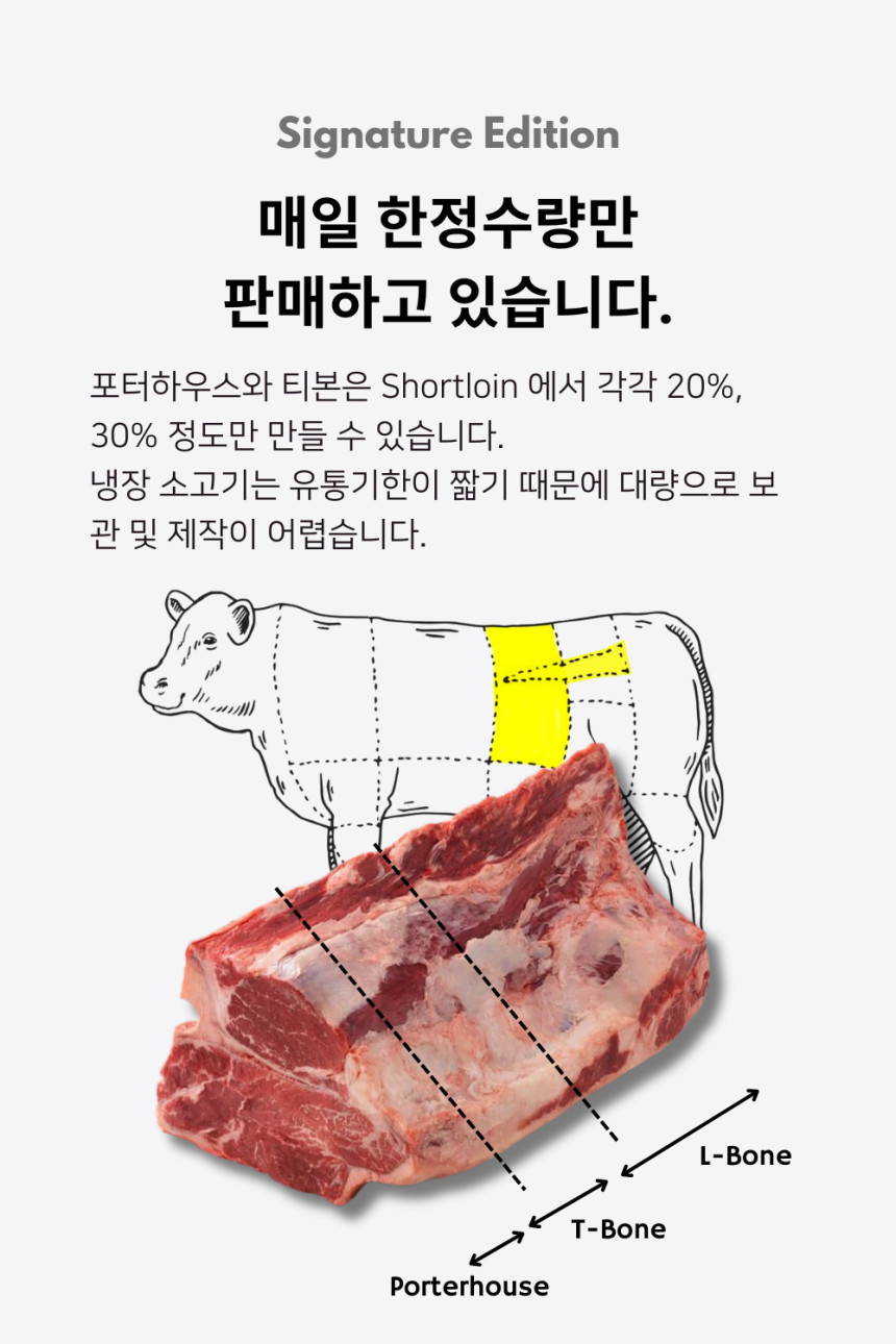 - 두 가지 부위의 조화: T자형 척추뼈 한쪽에는 부드러움의 대명사인 안심(Tenderloin)이, 반대쪽에는 진한 육향과 쫄깃함이 특징인 채끝 등심(Striploin)이 자리 잡고 있습니다.