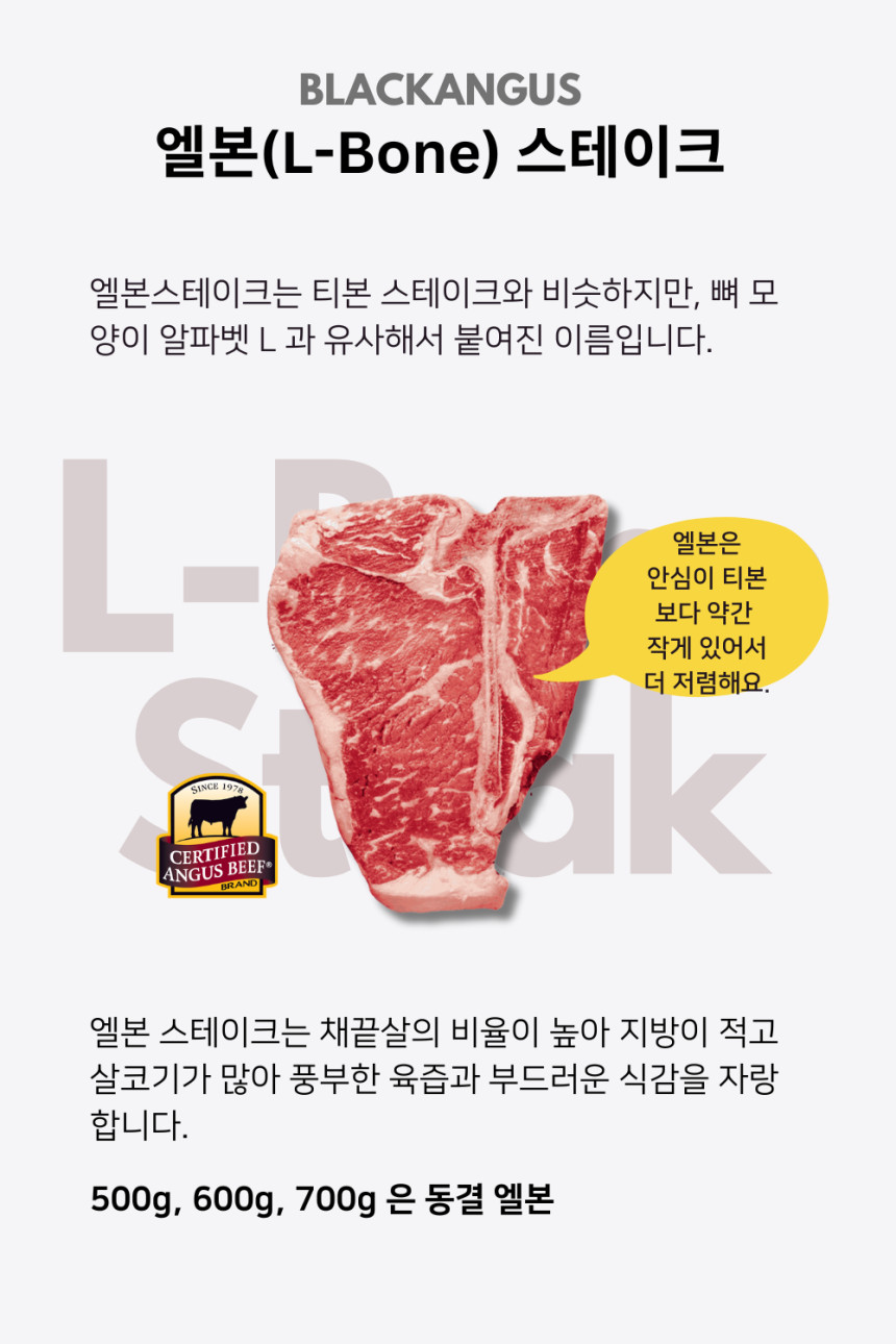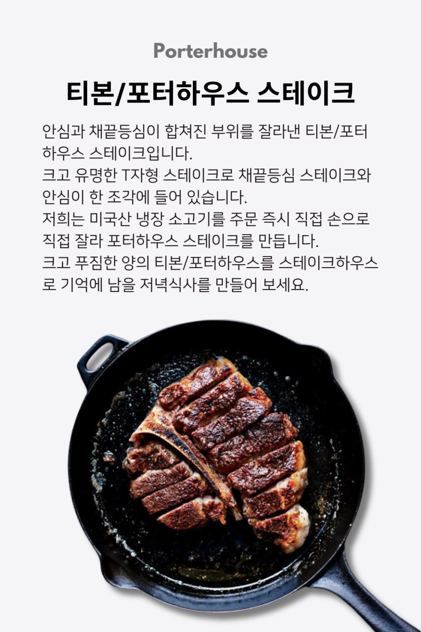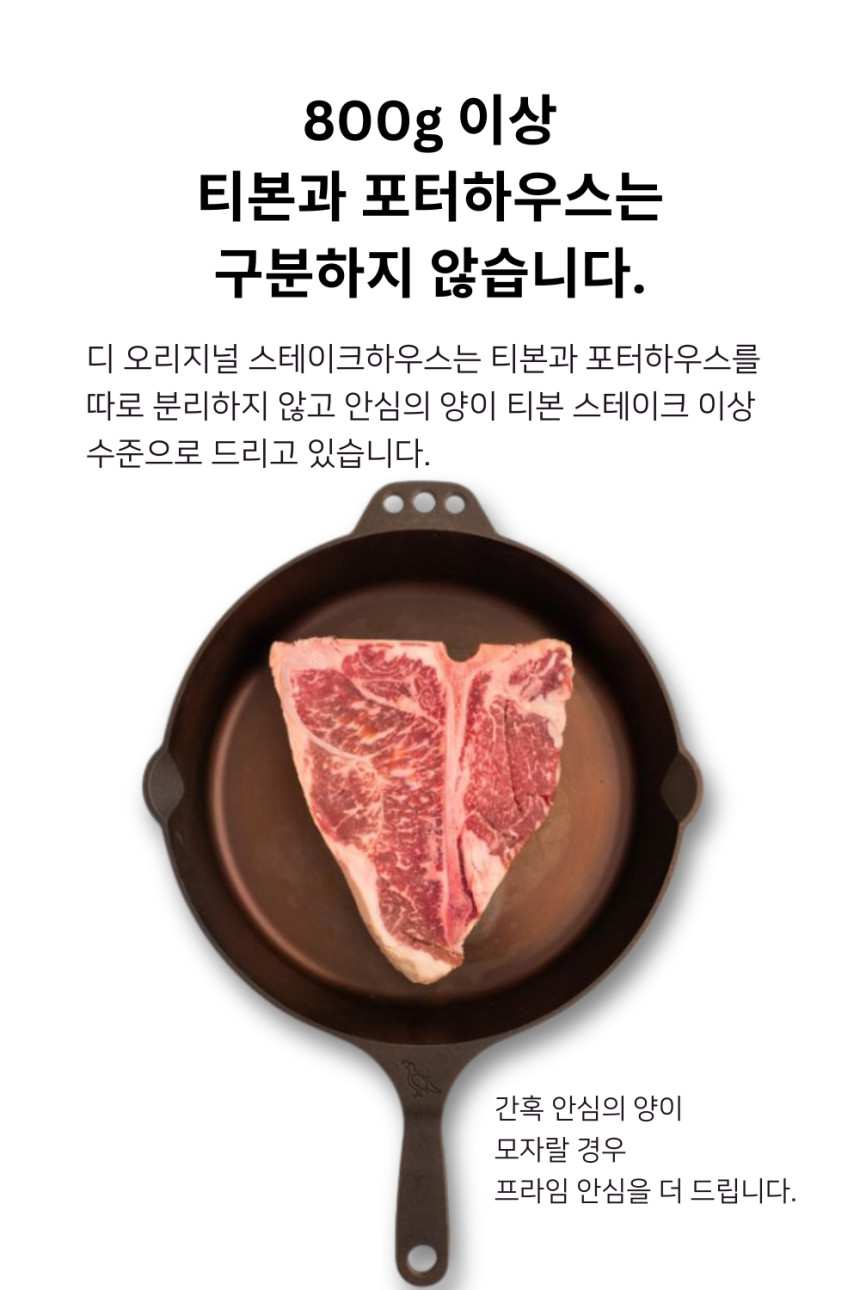 - 티본(T-bone): 안심이 먹을 만큼 붙어 있는 일반적인 크기입니다.